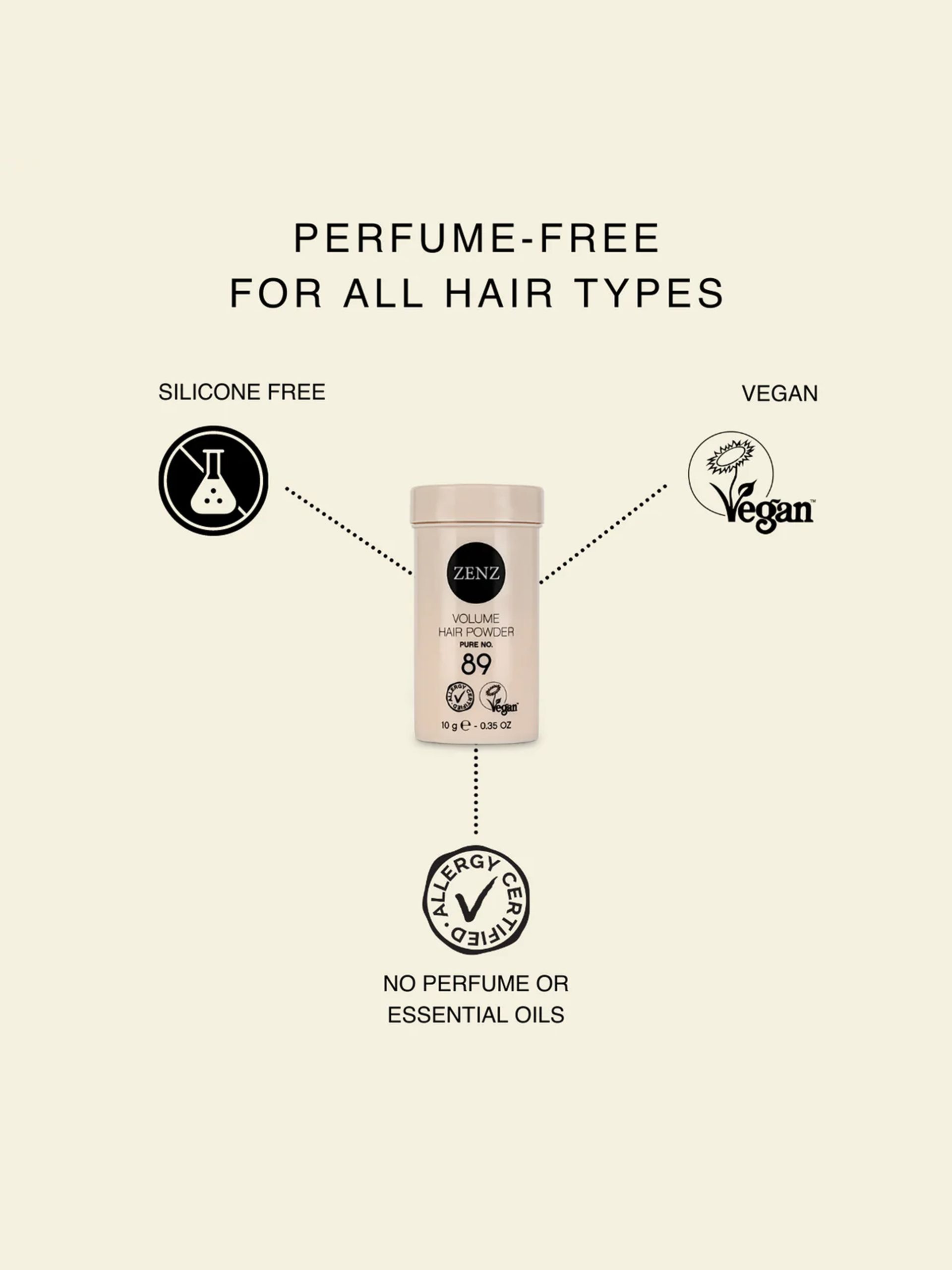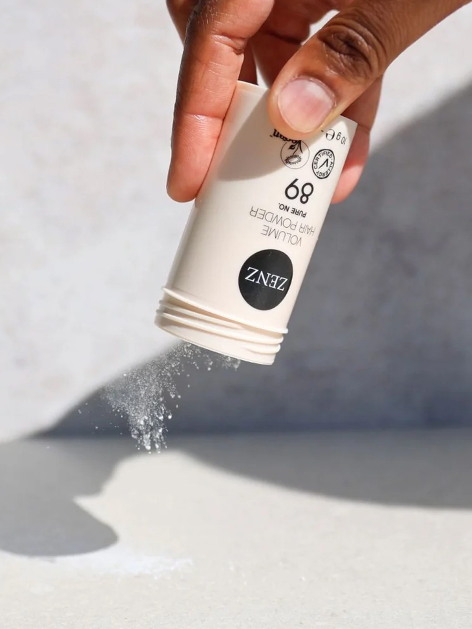 Pure Copenhagen Hair Powder No. 89 van het Deense Zenz. Het is een haarpoeder met zwanen- en allergielabel dat zorgt voor maximale body en hold in zowel kort als lang haar. Het poeder absorbeert vuil en vet van de haarstrengen, waardoor het haar er schoon en gezond uitziet. Volume Hair Powder nr. 89 is een haarpoeder voor alle haartypes. Vooral geschikt voor het geven van volume aan plat haar.